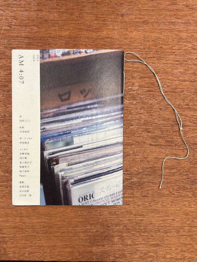 七月堂ZINE「AM 4:07」vol.4 発行いたします! 〈内容紹介〉 【第4号ゲスト】 詩| 向坂くじら 短歌| 小津夜景 エッセイ|〈テーマ:冬、AM 3:10〉 浅生鴨 青柳菜摘 【連載】 詩| 西尾勝彦 エッセイ| 全12回 Pippo/近現代詩紹介 西尾勝彦/マーホローバだより 第4回 池上規公子(葉ね文庫)/中崎町2番出口で考え中 第4回 後藤聖子(七月堂)/なんだかうまく眠れない。 第4回 全4回 城下康明(ひとやすみ書店)/ぼく、おつりもらいましたっけ? 最終回 選書│テーマ〈ある冬の午後、ちいさなブーケといっしょに自分のために買って帰りたい詩歌本〉 吉川祥一郎 / blackbird books 辻山良雄 / Title 加賀谷敦 / あんず文庫 カバー写真| 寺岡圭介(紙片) 「AM 4:07」創刊にあたって この、「詩」と「エッセイ」そして「書店」をテーマに立ち上げた雑誌のタイトルは、もうすぐ日の出を迎える空を見上げると、夜とも朝とも名付けられない景色が広がっているであろう七月の東京の空のことを想像してつけられました。どちらでもあって、どちらでもない。また、そのものでしかありえないもの。世界にはきっと、名付けられていないものが、名付けられたものの何百倍もあって、そんなことには関心を持たずに存在しているような気がします。 自分らしく生きるということが、何者かになるためではなく、ただその人そのものであればよいと思えたら。 これからの七月堂が目指したいことのひとつ、「自分らしくあれる場所」を自分自身の手で作り守っていくために、全一二回の発行を目標に創刊しました。 詩を書く人と、読む人と、売る人の架け橋になることを願い、ありったけの感謝の気持ちをこめて作っていきます。 手にしてくださる方にとって、思いがけずふと、詩的な世界を楽しんでいただける雑誌になれることを願っています。 2024年3月 七月堂 後藤聖子 発行人┆後藤聖子 組版・デザイン┆川島雄太郎 写真┆寺岡圭介(紙片) 製本指導┆紙とゆびさき 印刷・製本・発行┊七月堂 発行日┆2025年12月5日 発売┆11月23日 (版元オンラインサイトより引用)