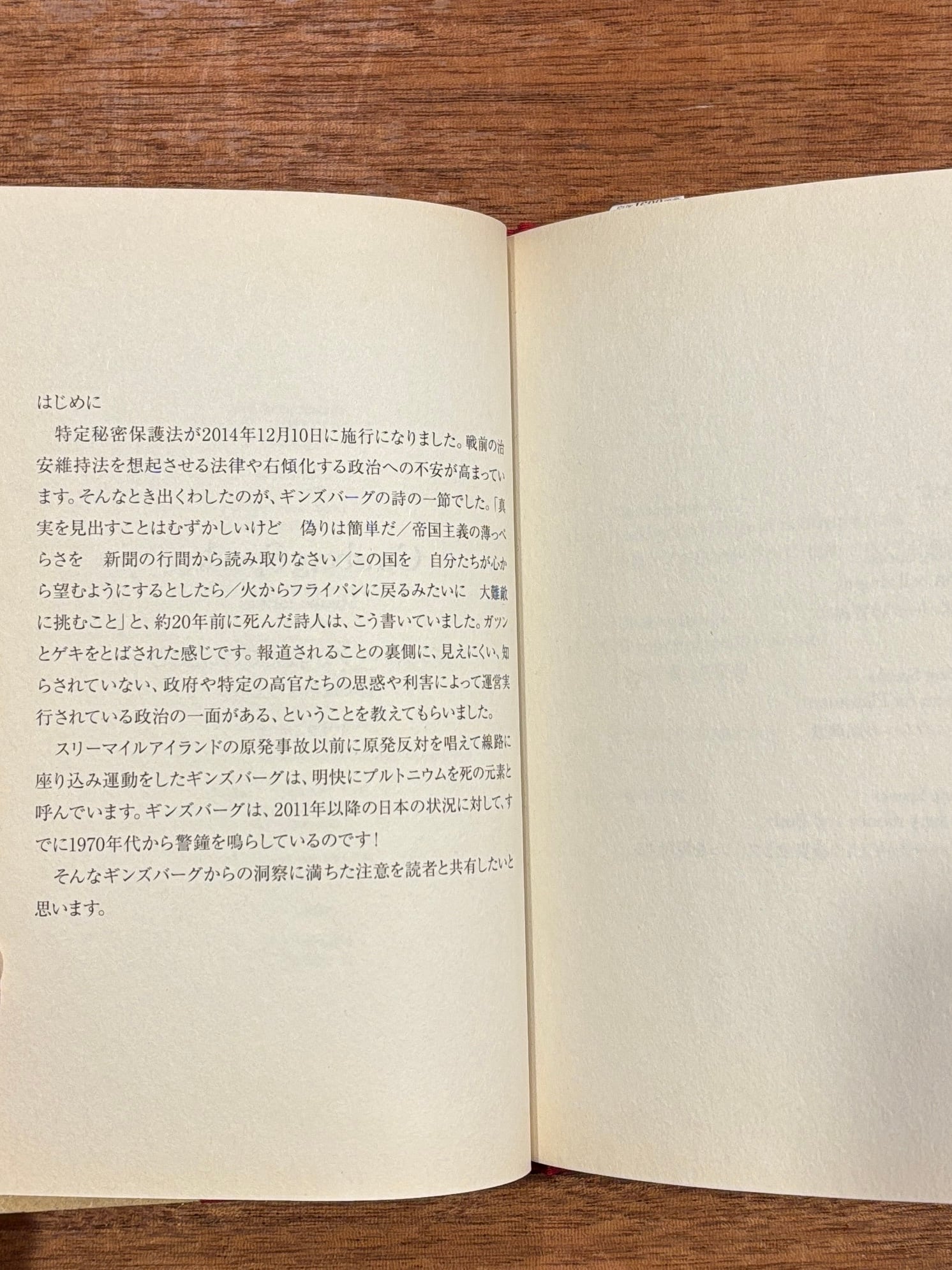 スリーマイルアイランドの原発事故以前に原発反対を唱えて線路に座り込み運動をしたアメリカの詩人ギンズバーグ。プルトニウムへの鎮魂歌、全体主義への警鐘……。ギンズバーグの詩を通して政治を考える。